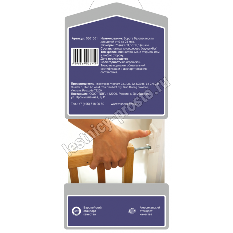 Изделие имеет раздвижную конструкцию с большим диапазоном - от 63.5 до 105 см и может быть установлено в любые дверные или лестничные проемы, в качестве основного материала используется натуральное дерево (бук) с высококачественной шлифовкой.
