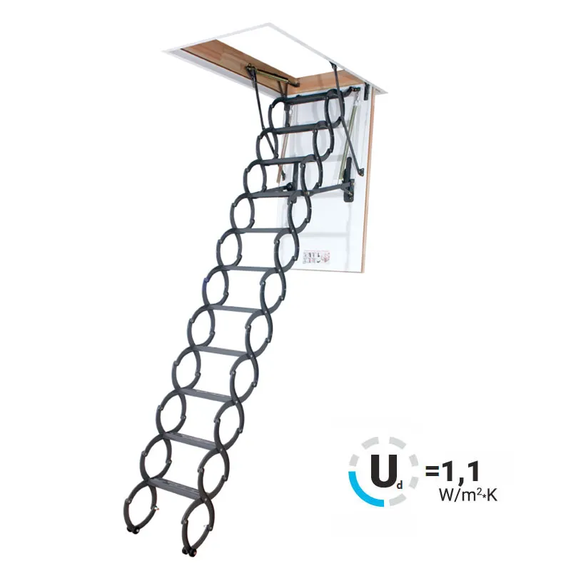Автоматическая раздвижная ножничная чердачная лестница, с электромотором для дистанционного открывания.
