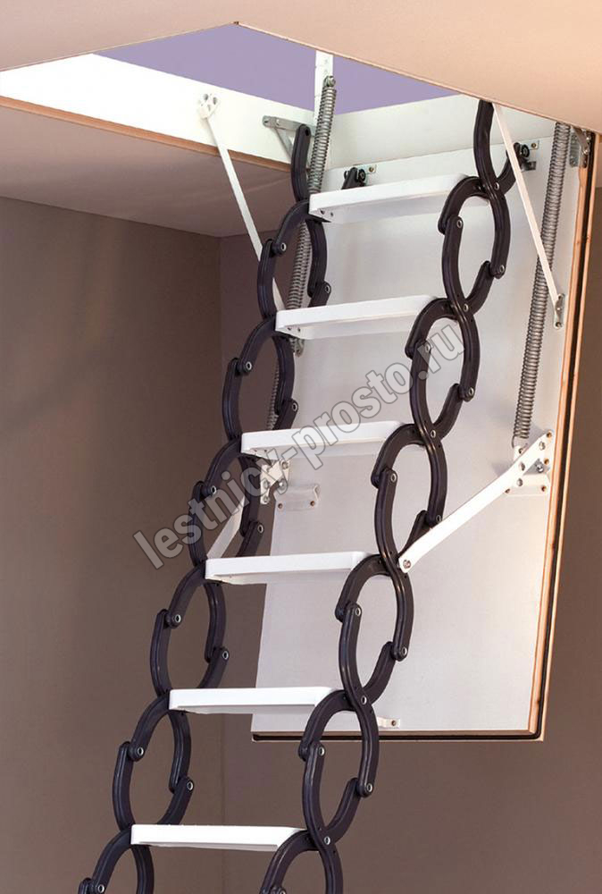 Ножничная лестница ELEGANCE износоустойчива, оснащена надежными металлическими защелками.