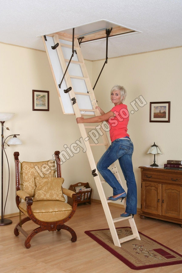 Лестница складная трёхсекционная, изготовлена из сосны. Термоизоляционная крышка типа "сэндвич" утеплена пенопластом, облицована с двух сторон ДСП белого цвета. Короб люка с однослойным уплотнителем. Все металлические элементы лестницы покрыты порошковой краской, ступени лестницы имеют антискользящие насечки и закреплены в столярное соединение «ласточкин хвост», что позволяет выдерживать нагрузку до 150 кг. Деревянный стержень для открывания лестницы в комплекте.