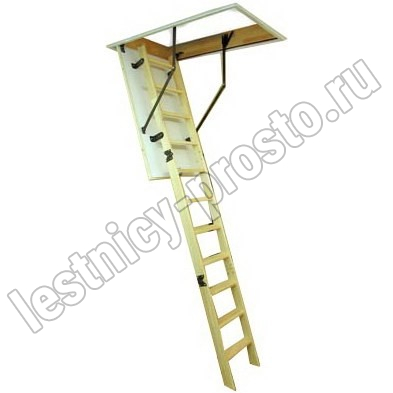 Лестница складная четырехсекционная, изготовлена из сосны. Термоизоляционная крышка типа "сэндвич" утеплена пенопластом, облицована с двух сторон ДСП белого цвета. Короб люка с уплотнителем. Все металлические элементы лестницы покрыты порошковой краской, ступени лестницы имеют антискользящие насечки и закреплены в столярное соединение «ласточкин хвост», что позволяет выдерживать нагрузку 150 кг. Деревянный стержень для открывания лестницы в комплекте.