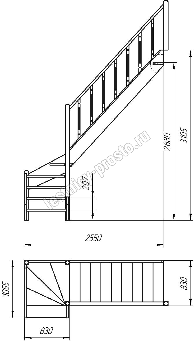 Деревянная межэтажная лестница ЛЕС-07 2880-3085 проем 2550-830, Сосна