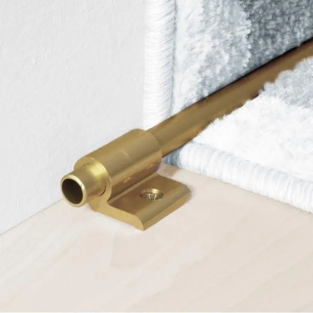 Ковродержатель комплектуется двумя держателями из латуни цвета золото, а также цельным прутком из латуни длиной от 101 до 130 см. Конструкция является сборно-разборной не требующей демонтажа креплений, что делает ее долговечной и очень удобной для чистки ковров и ковровых покрытий.