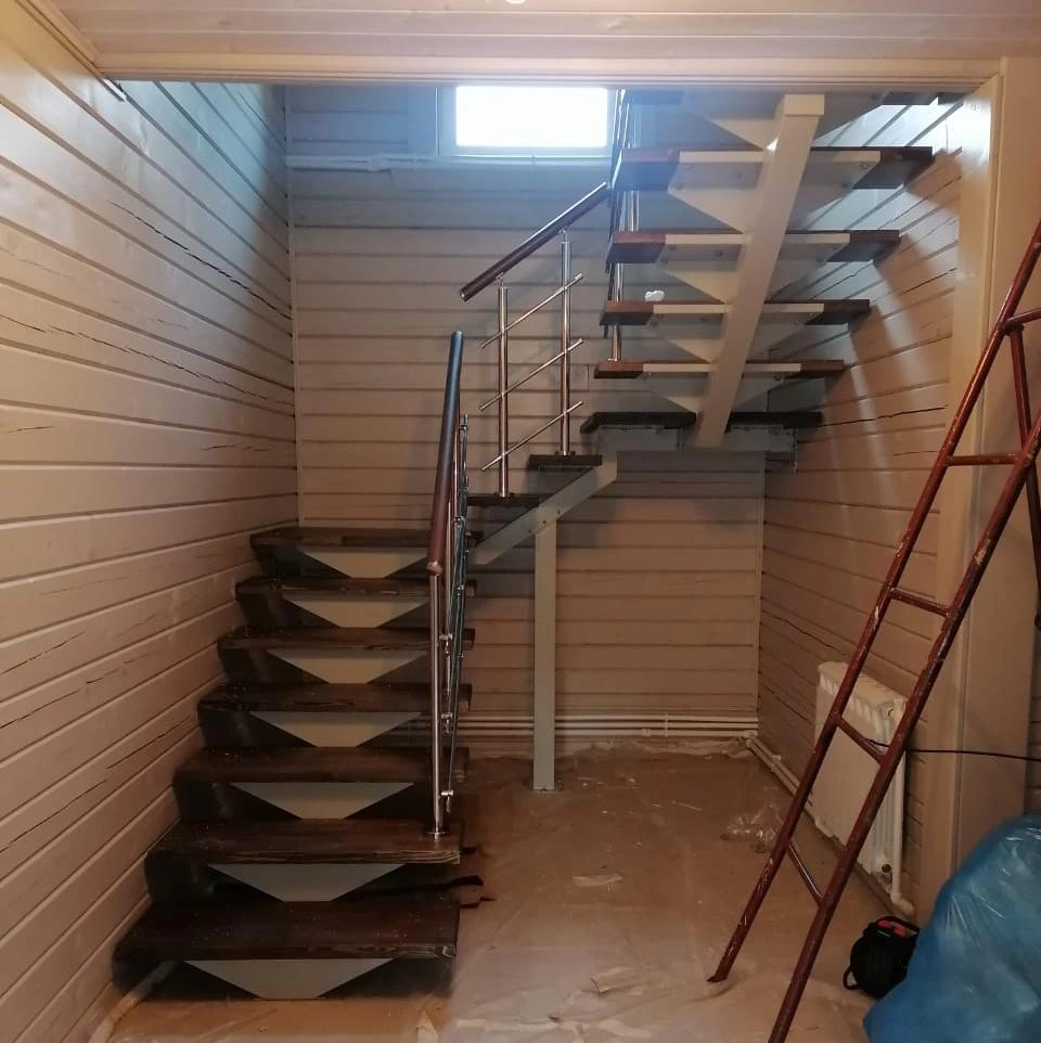 Конструкция представляет собой стальной монокосоур, на который крепятся ступени из выбранной породы дерева.