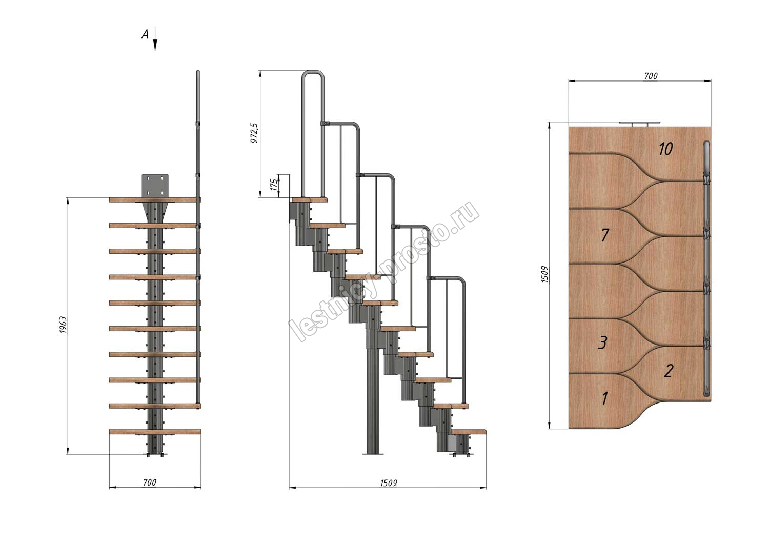 Лестница Prosto Urban Black гусиный шаг 700 мм, h180-264 см (10 ступеней), бук