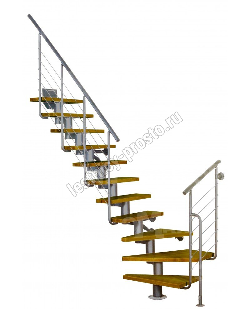 Есть возможность регулировать высоту ступеней. В комплект входят перила с вертикальными стойками и горизонтальными перегородками.
