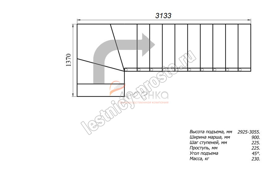 Модульная лестница Фаворит 225 2925-3055, Серый, Сосна, Нержавеющая сталь