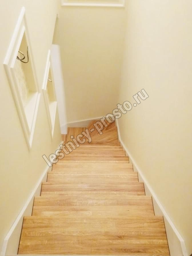 Ступени лестницы изготовлены из дерева категории А/В паркетной склейки без какого-либо покрытия.