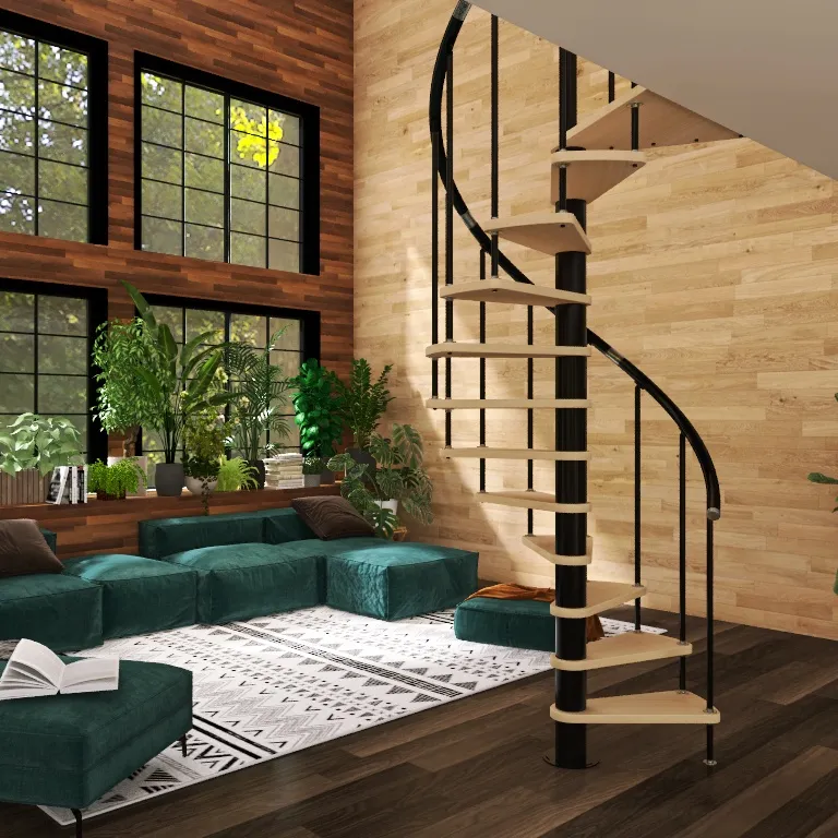 Лаконичная малогабаритная стильная винтовая модульная лестница с чёрным каркасом.