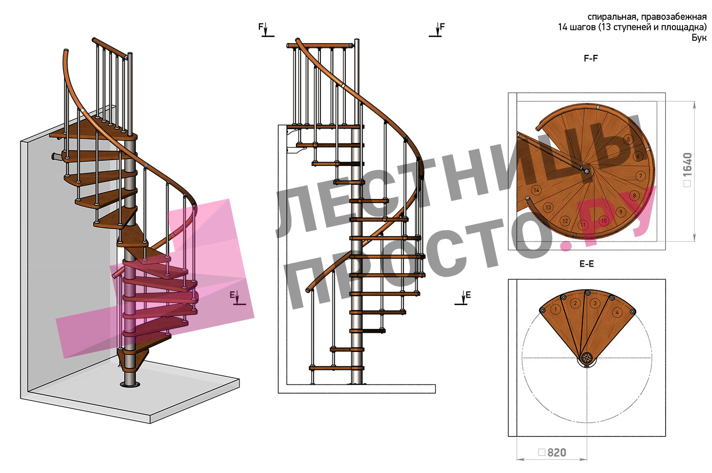 Правая, d=160см, 13 ступеней + площадка