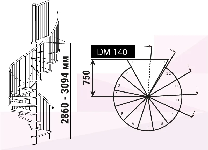 Лестница представлена в двух вариантах: с поворотом направо и с поворотом налево. Благодаря возможности регулировать высоту шага с помощью пластиковых вставок (входят в базовый комплект), высоту лестницы можно варьировать в пределах от 2860 до 3090 мм. Кроме того, купив дополнительную секцию для этой лестницы, можно поднять высоту до 3320 мм. Перила изготовлены из алюминия и окрашены "под дерево".
