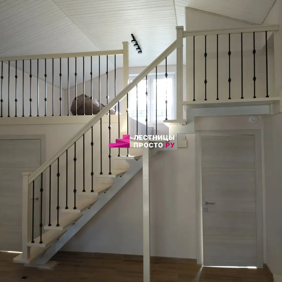 Лестница из сосны с поворотом и подступёнками для частного дома